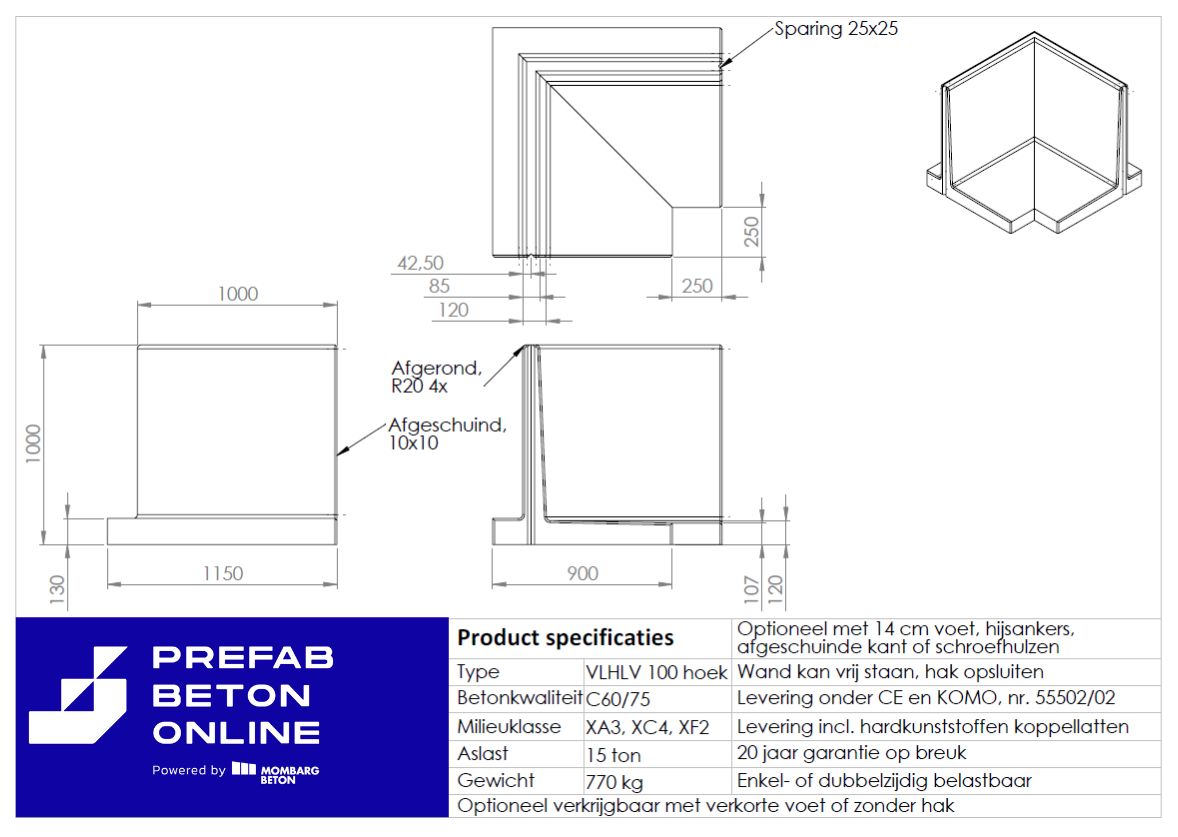 Keerwand met hak 1000mm hoog hoekelement