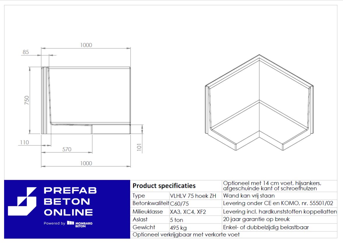 Keerwand zonder hak 750mm hoog hoekelement