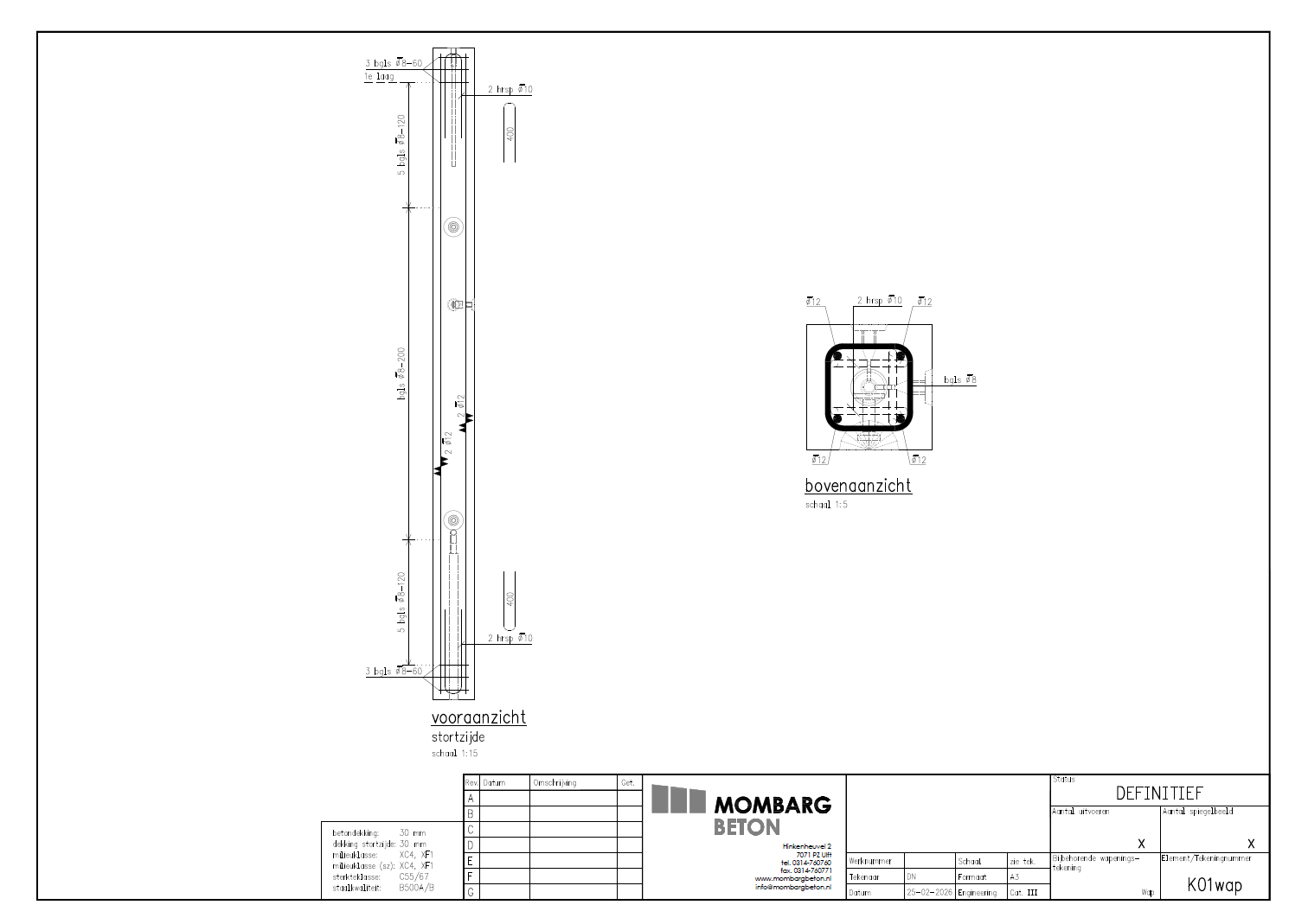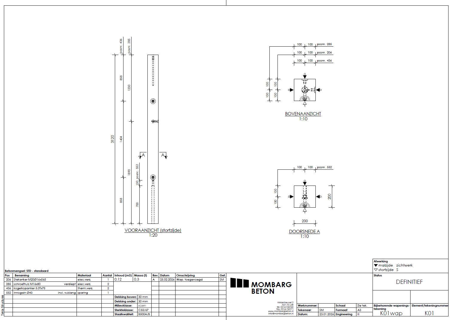 Tweede kans kolom, esthetisch afgekeurd vanwege luchtbelletjes en vlekken. Zie foto's. De kolom is 3120mm lang, 200mm breed en 200mm dik. Voorzien van 1 Stekanker M20Ø16x565, twee schroefhulzen M16x80, twee kogelkopankers 5.0T/75 en één innogain Ø43.